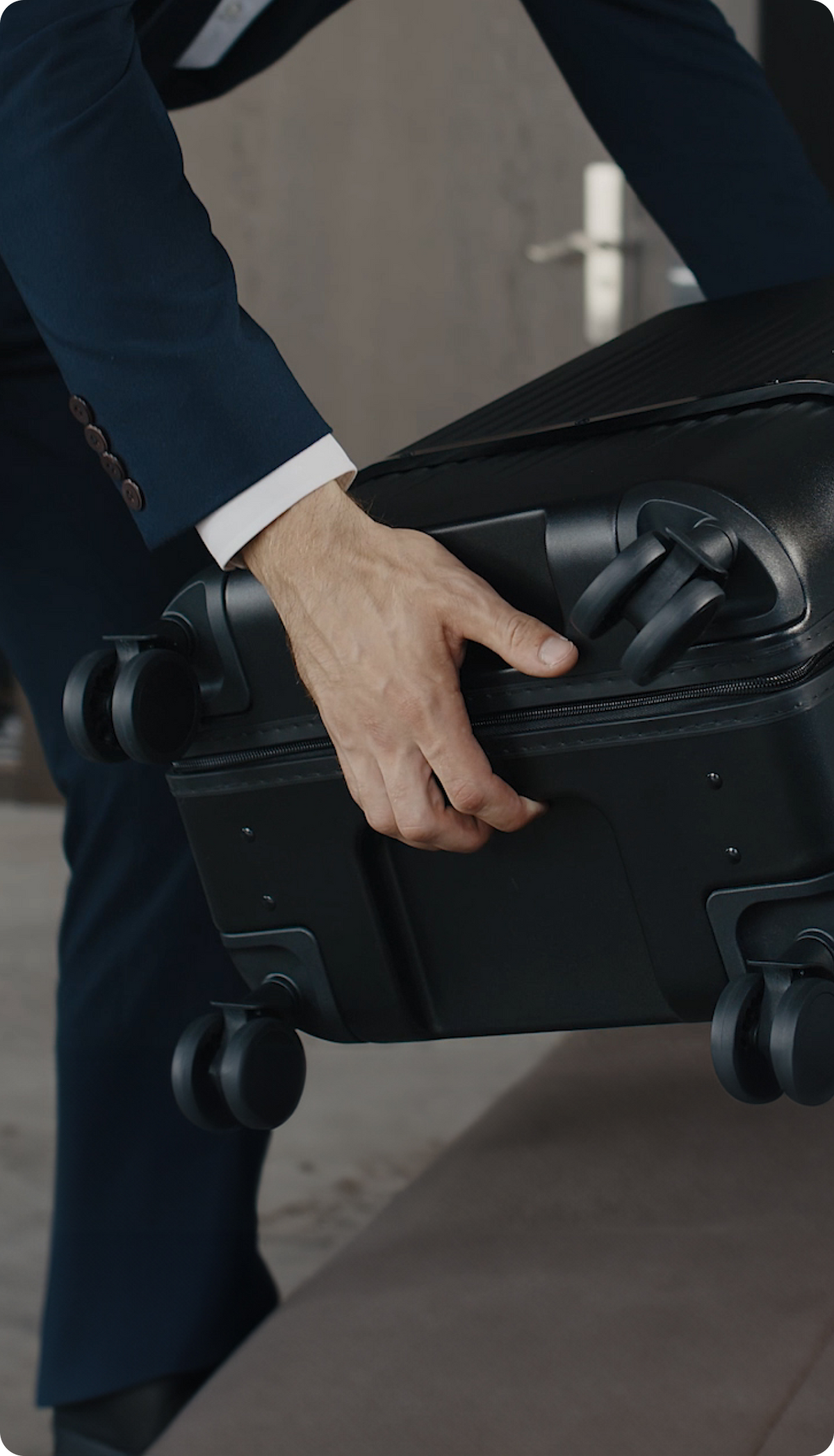- With one hand, lift the suitcase, and with the other hand, press the expansion button located below the handle. Place the suitcase on the ground and compress it downwards.